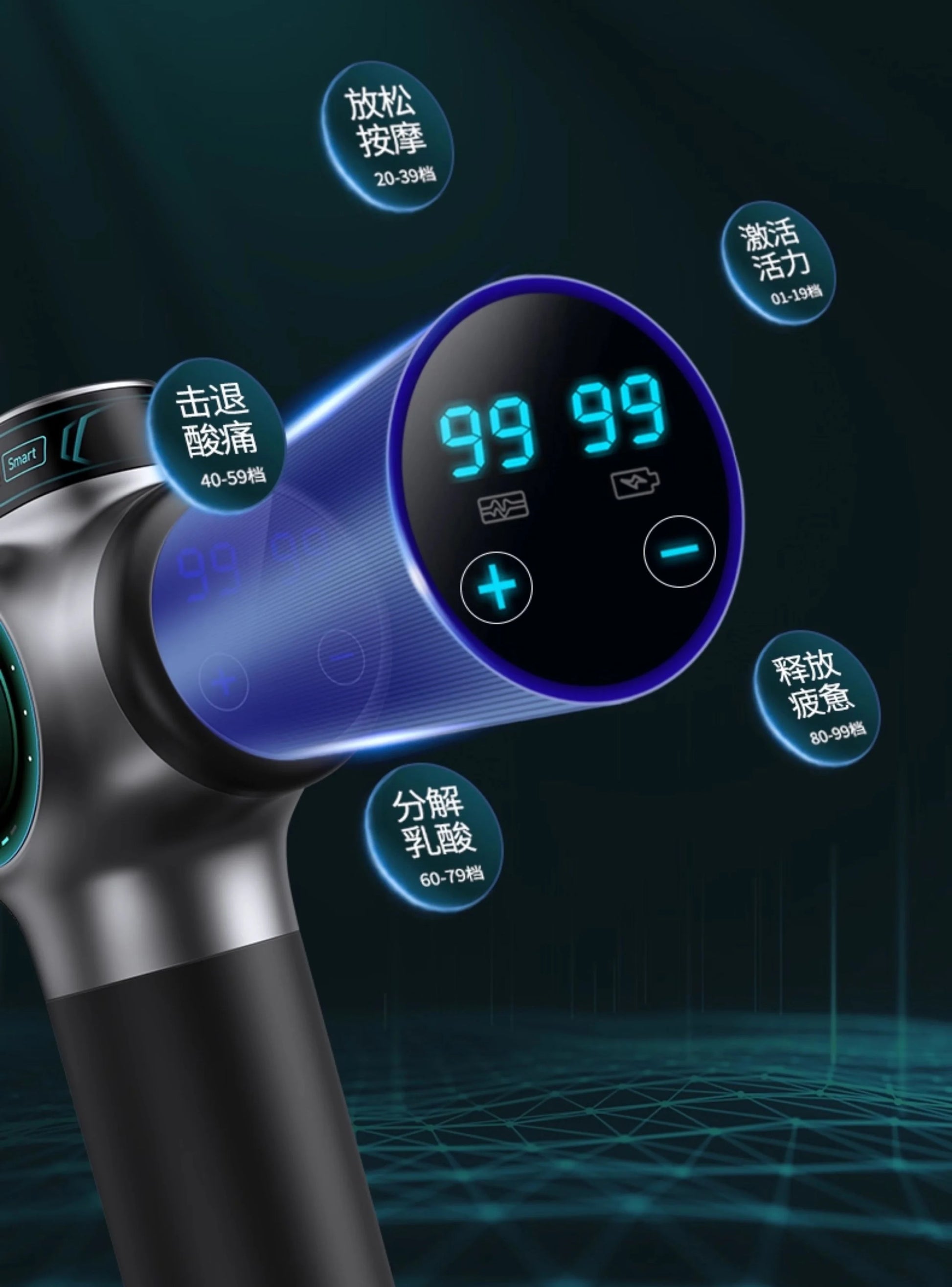 Equipped with a high-thrust motor (18KG thrust, 4500 RPM) and an upgraded AI intelligent control chip, it precisely controls the impact force to deeply disperse lactic acid and relieve muscle soreness. It supports 99-speed intensity adjustment to match massage strength as required. -